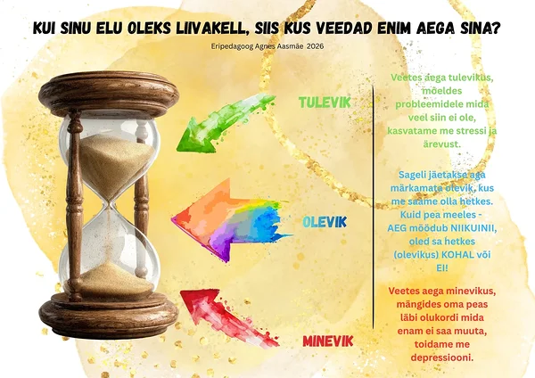 Tõlkisin ja kirjeldasin talle videot - "kujuta korraks ette, et liivakell sümboliseerib sinu elu. Ülemine osa on sinu tulevik, alumine aga minevik...". Ma ei jõudnud sellest punktist kaugemale, kui minu laps ütles "ja keskmine osa on praegu ...". Olin tema mõttekäigust hetkeks jahmunud ja sain aru, kui väga ma ise olen olevikust kaduma läinud. Laps tundis huvi, et miks nii inimestega on ning püüdsin talle parimal moel selgitada miks suurtega (nii noorte, kui täiskasvanutega) nii juhtub.